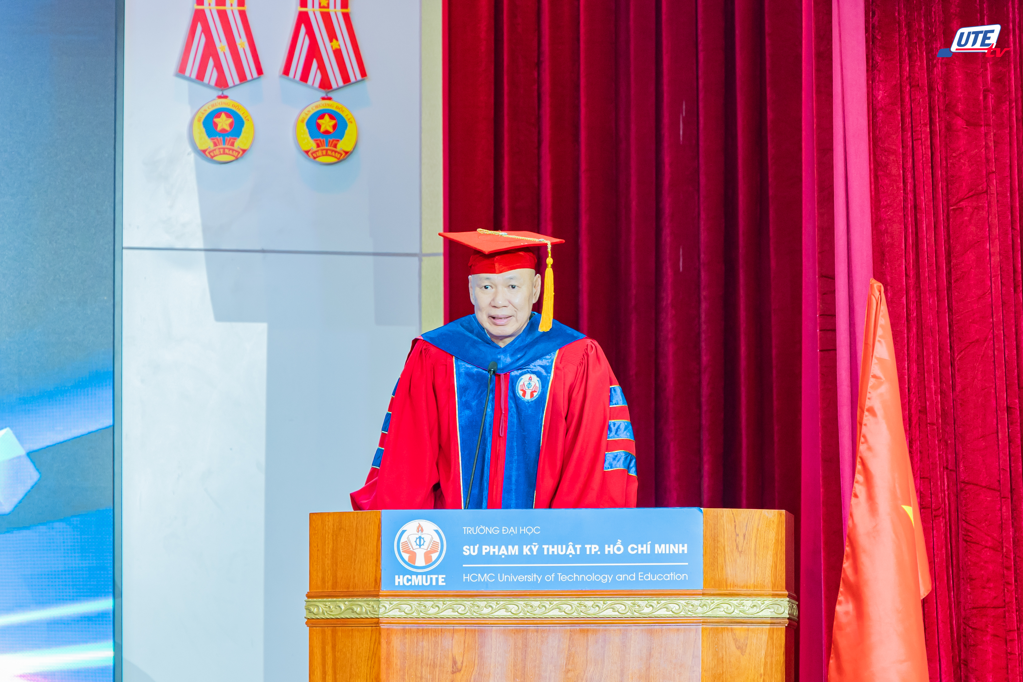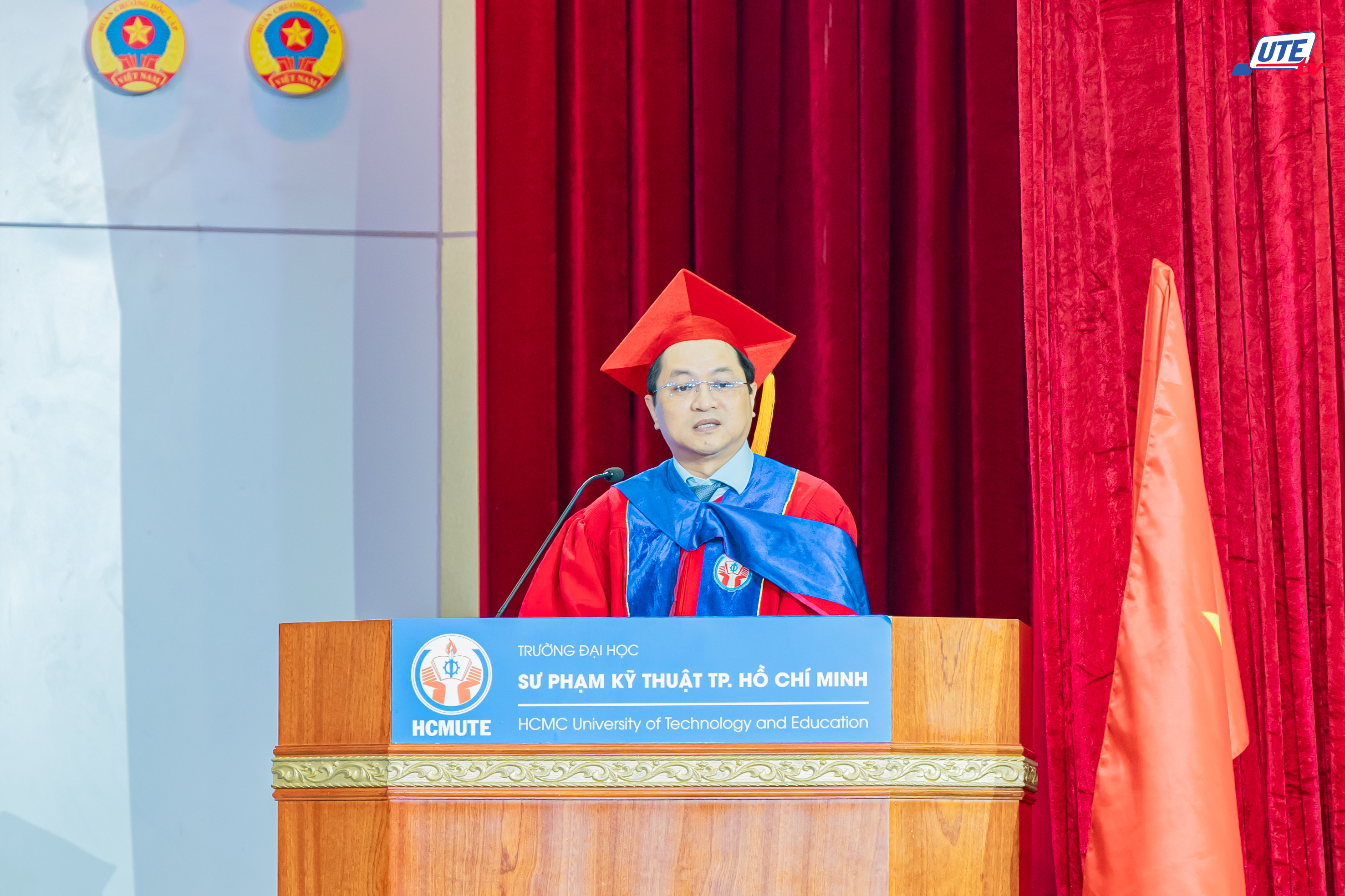 Phát biểu khai mạc, PGS.TS. Lê Hiếu Giang gửi lời chúc mừng đến toàn thể các tân Cử nhân đã hoàn thành hành trình học tập đầy nỗ lực. Thầy nhấn mạnh: “Khi các em bước vào chặng đường mới, hãy luôn giữ tinh thần học hỏi, khiêm tốn và dùng tri thức của mình để làm cho thế giới tốt đẹp hơn mỗi ngày.” Thầy cũng gửi lời cảm ơn chân thành đến Đại học Northampton và Học viện TMC đã đồng hành cùng HCMUTE trong suốt quá trình triển khai chương trình, góp phần mang đến cho sinh viên Việt Nam cơ hội tiếp cận nền giáo dục chuẩn quốc tế.