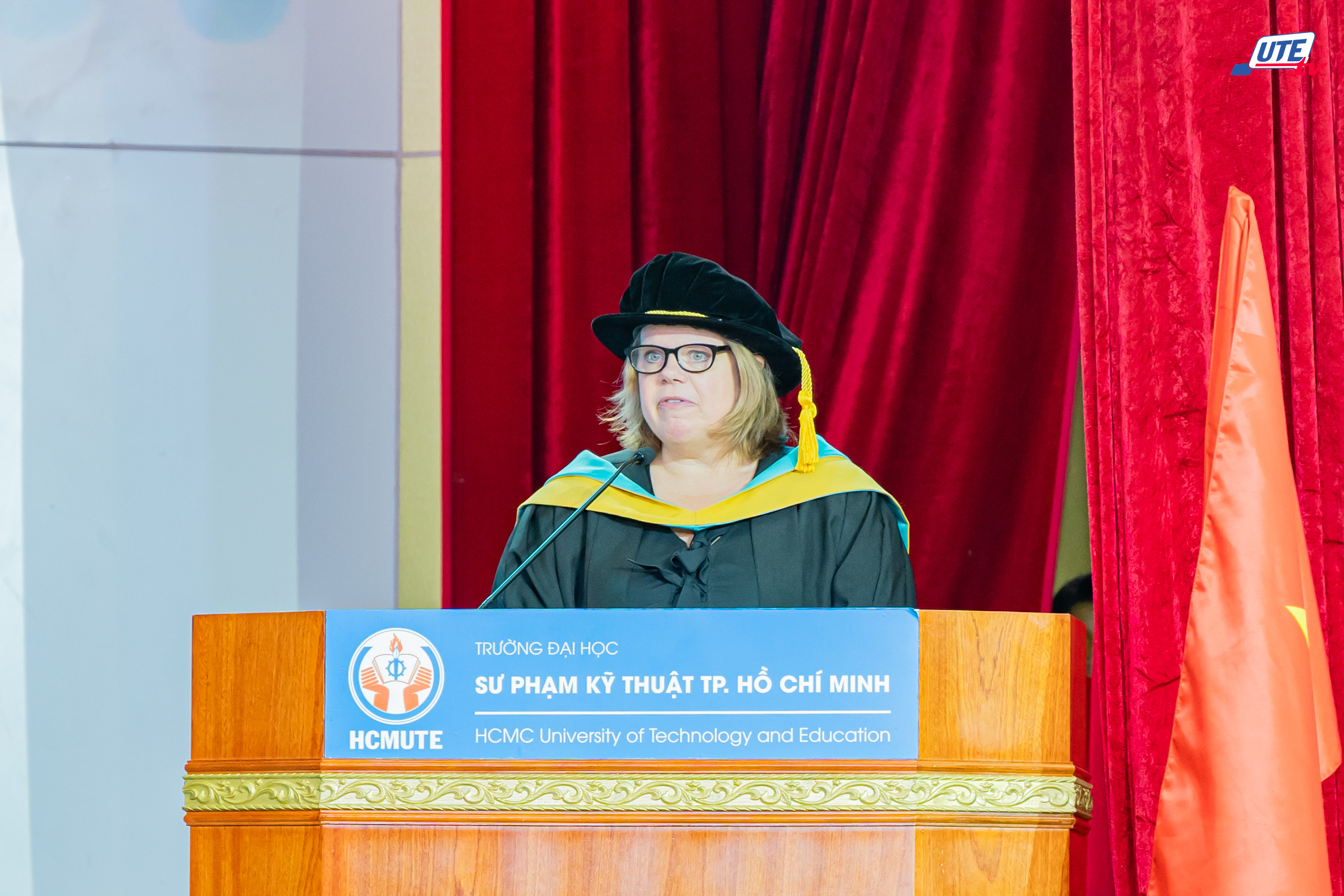 Đại diện Đại học Northampton, bà Karen Johns bày tỏ niềm tự hào khi chứng kiến các sinh viên Việt Nam tốt nghiệp với kết quả xuất sắc. Bà nhấn mạnh rằng, mối quan hệ hợp tác giữa HCMUTE và Đại học Northampton không chỉ giúp sinh viên được học tập trong môi trường toàn cầu mà còn mở ra cơ hội trao đổi học thuật và nghiên cứu giữa hai bên trong tương lai.