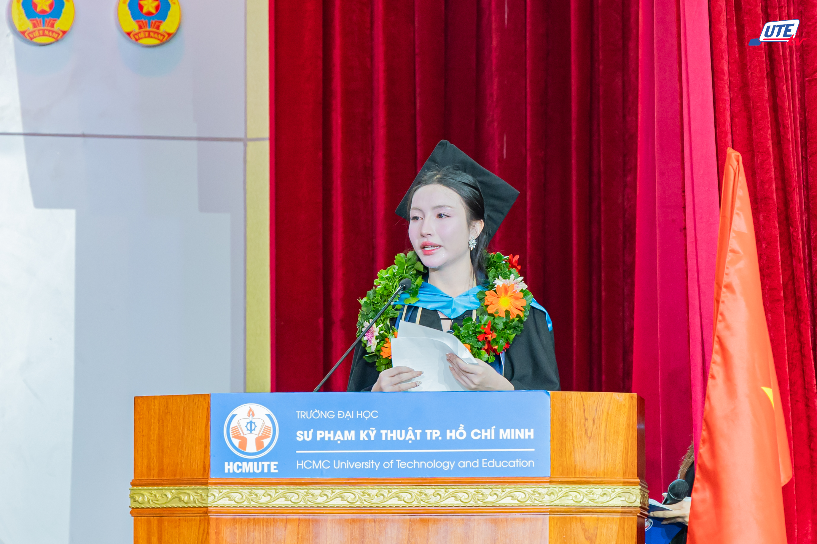 Đại diện sinh viên tốt nghiệp, tân Cử nhân Trương Ngọc Châu đã gửi lời tri ân sâu sắc đến Ban Giám hiệu, các giảng viên và đối tác quốc tế đã tận tâm đồng hành, hướng dẫn và truyền cảm hứng trong suốt quá trình học tập. Em cũng không quên gửi lời cảm ơn đến cha mẹ và gia đình, những người đã luôn yêu thương, ủng hộ và tin tưởng chúng em vô điều kiện. Chính niềm tin của mọi người là động lực lớn nhất giúp chúng em có thể đi đến ngày hôm nay.